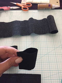 Next cut about 26 inches of the 22 gauge wire. Then cut a ribbon piece about 1/2 of an inch from your roll and place a dot of hot glue on one side of the paper ribbon and wrap around the wire. Once you reach the bottom of the wire, place another dot of hot glue to the end of the paper and hold until cooled. Now cut the wire in to 5 even sections: