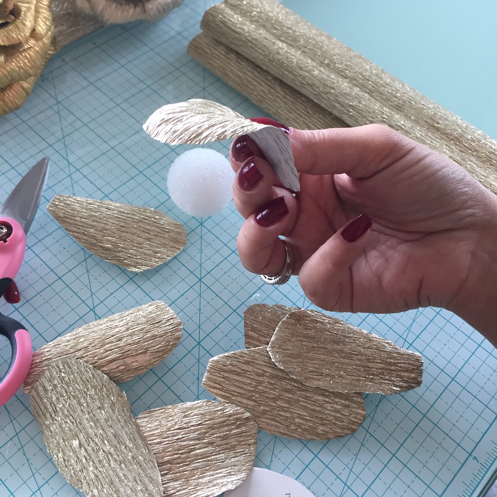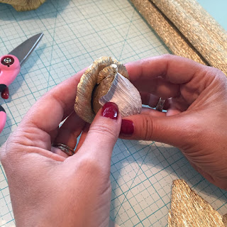 Now place the 2 inch foam ball on the back of the petal and wrap the petal around the foam ball: