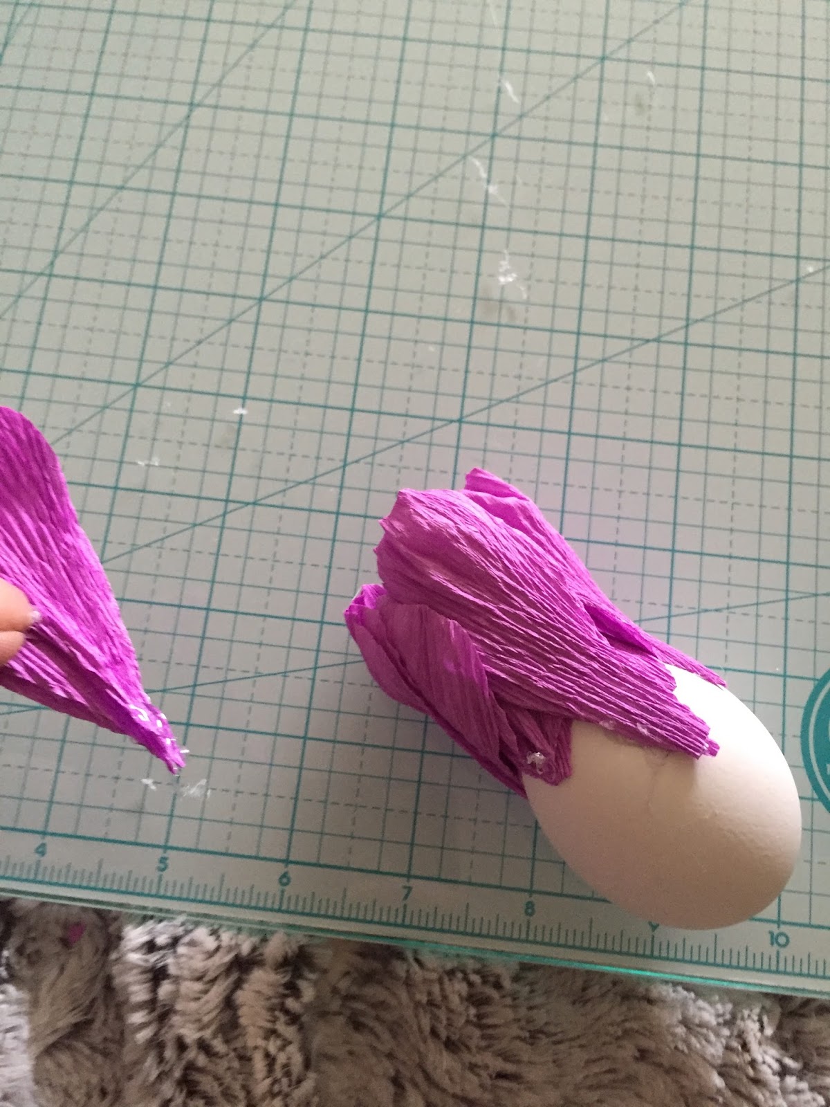 Then hot glue the petals to the egg. Repeat this process three times around the egg: