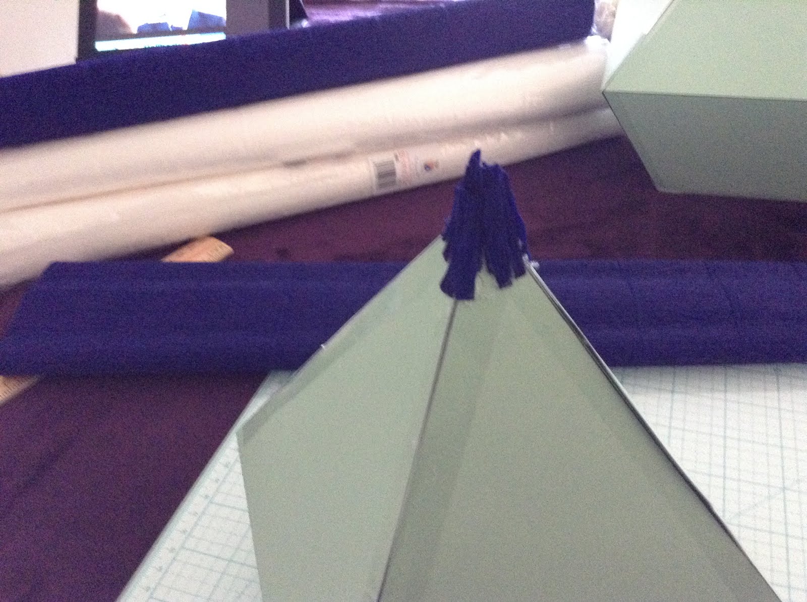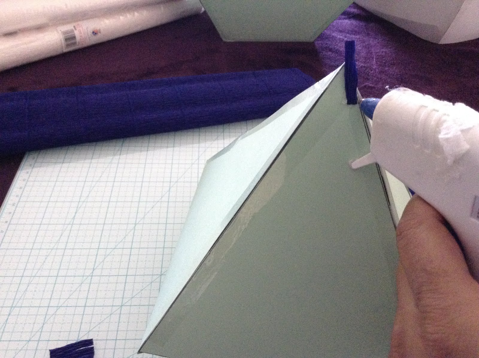 It is time to cover the top of the diamond box. I'm showing this step of the project when I was finishing up the red diamond box. As you are placing the crepe paper on top of the diamond box, you want to place a line of glue on the box and stick the crape paper on it: