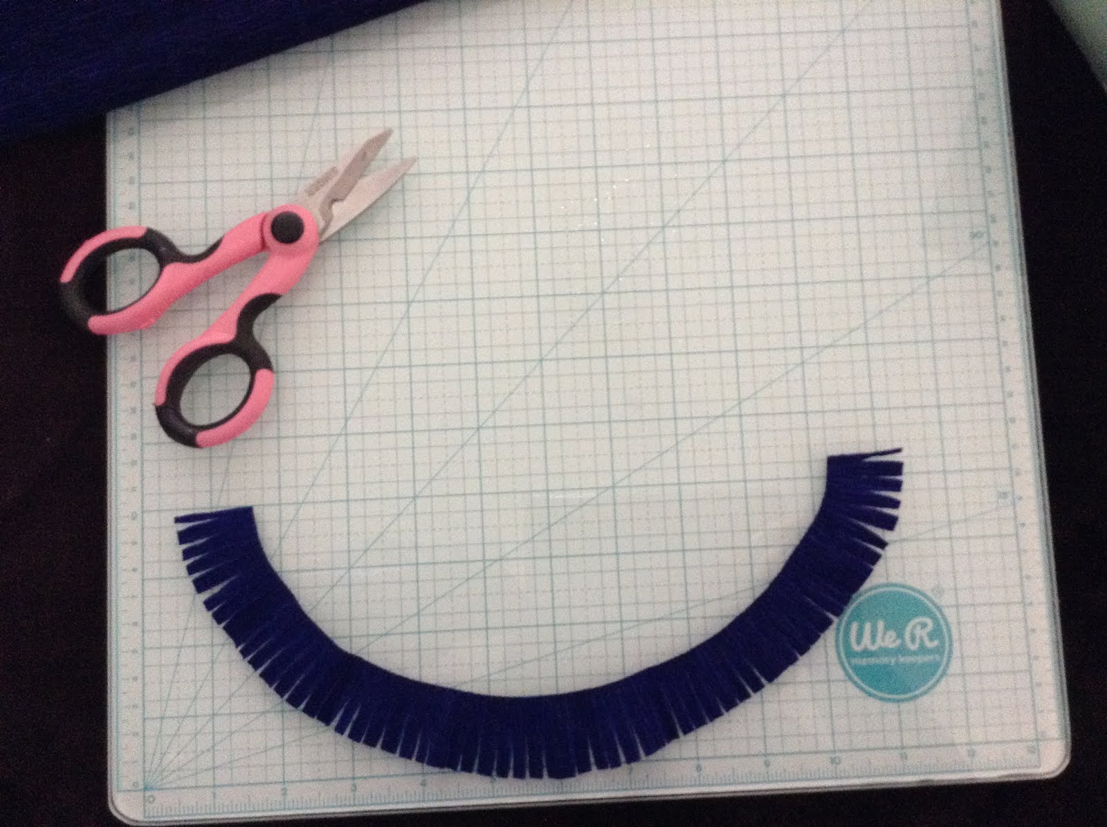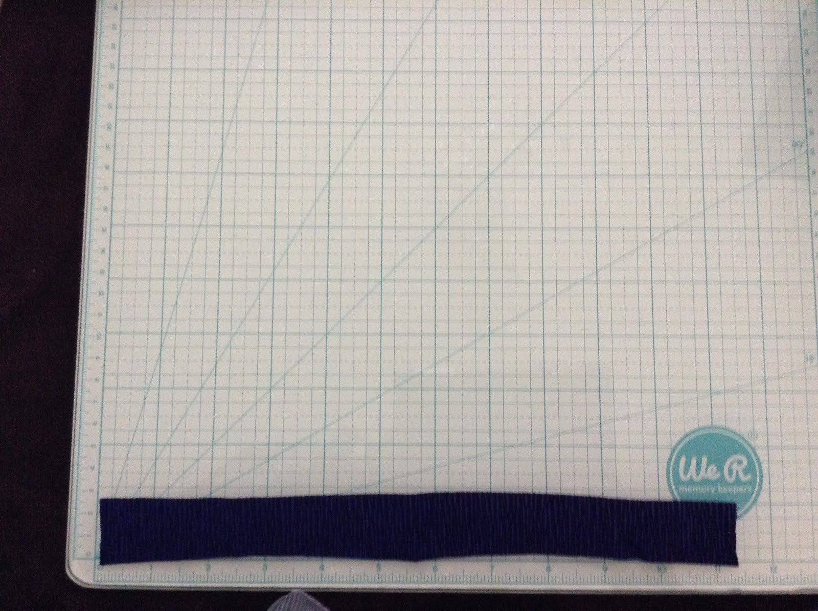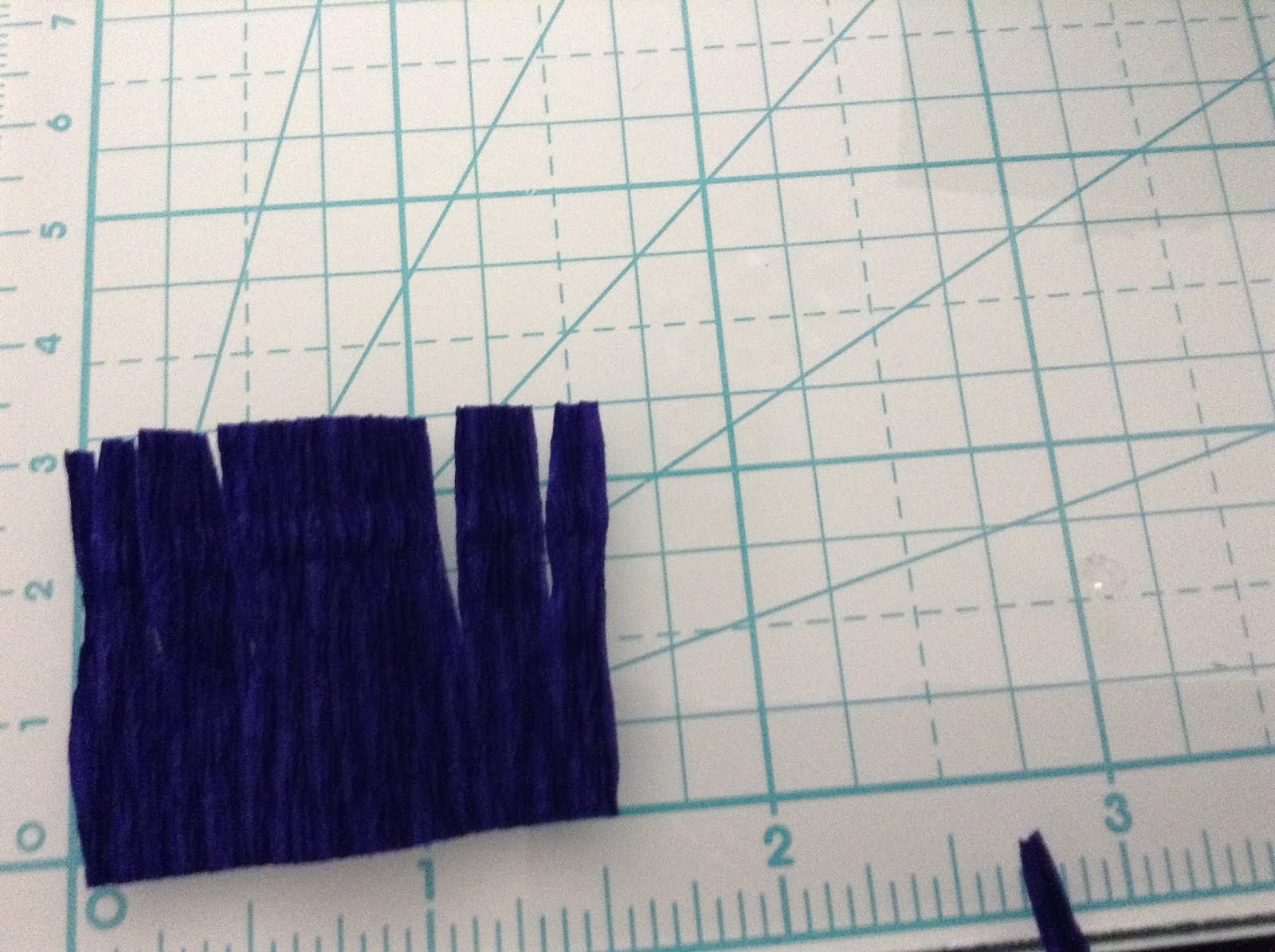 Roll out 11 inches of the crepe paper and cut it along the with of the roll. Then make 1-1/4 inch cuts across the grain in order to end up with sixteen 1-1/4"X11" paper strips: