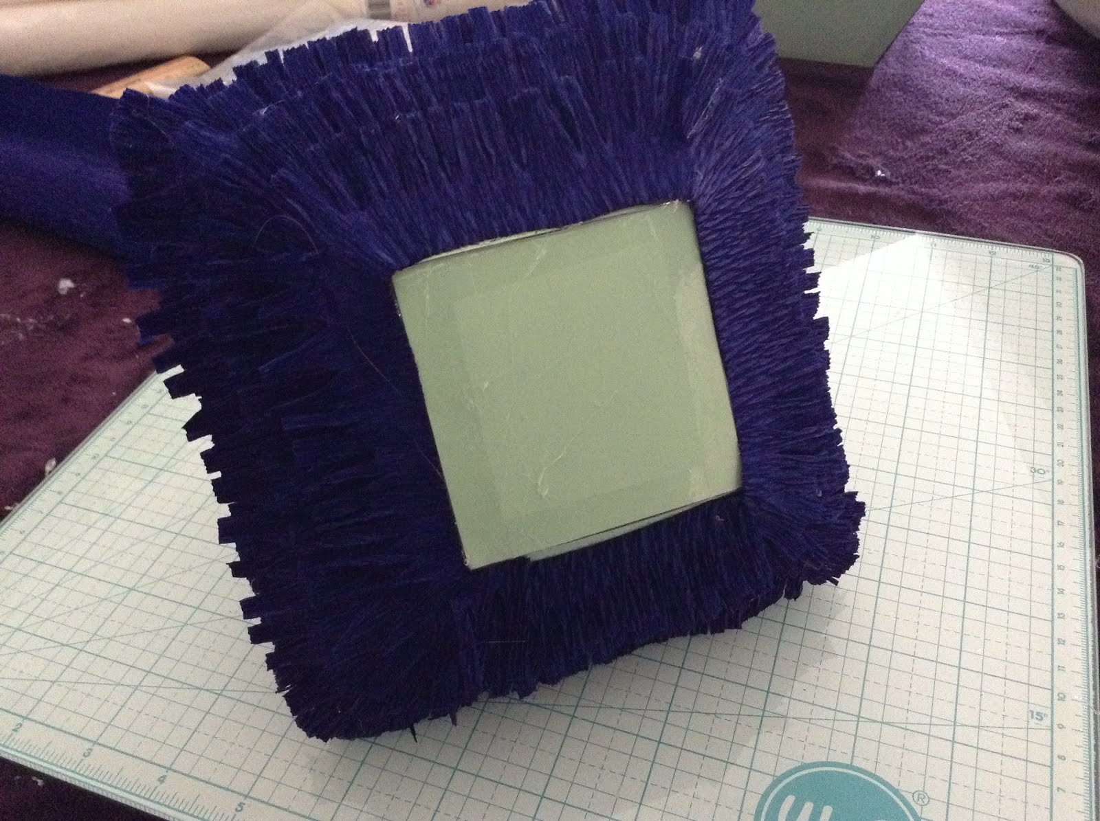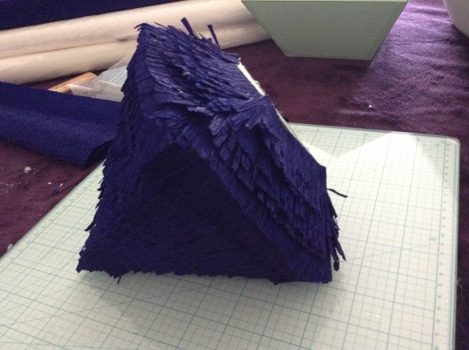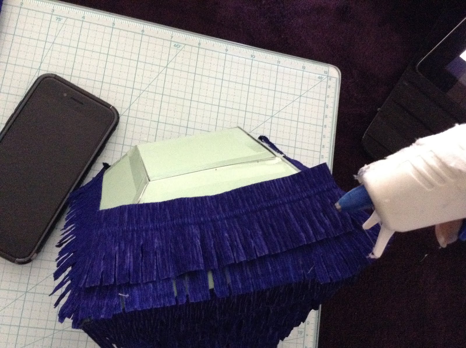Then work your way around the same area by adding more strips overlapping the previous crepe paper that you glued to the bottom of the diamond shaped box: