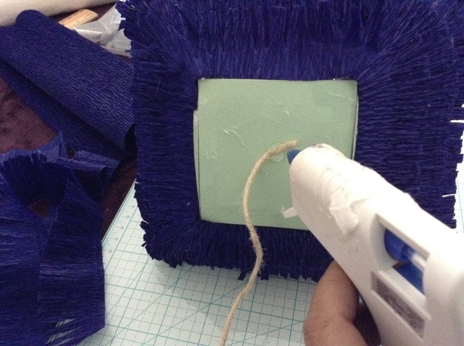 Now we need to install the Burlap rope so we can hang our creation before covering the top of the diamond box: